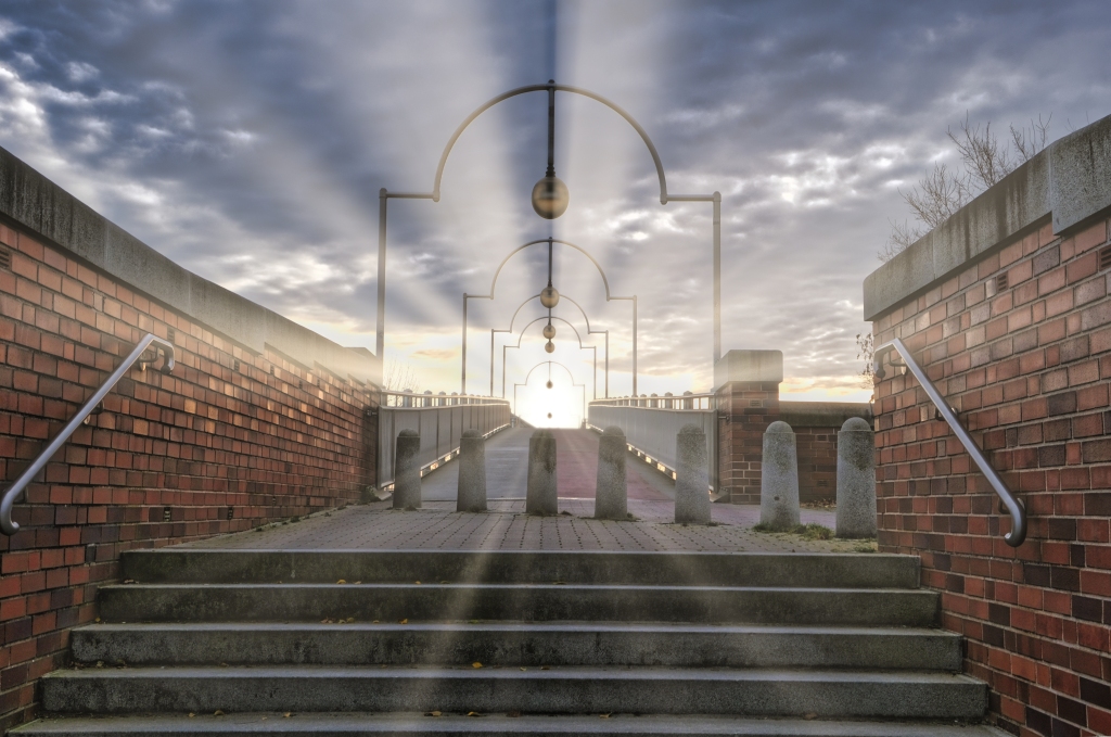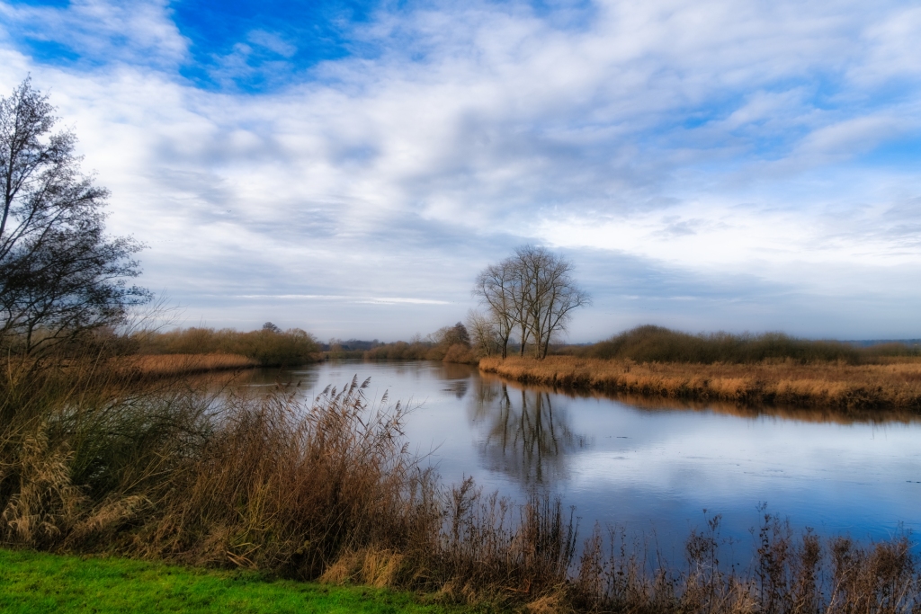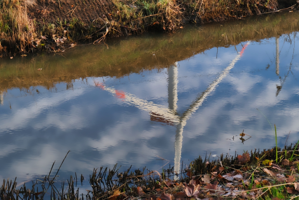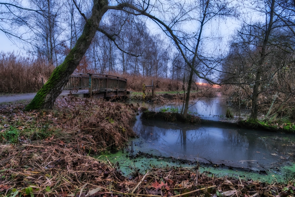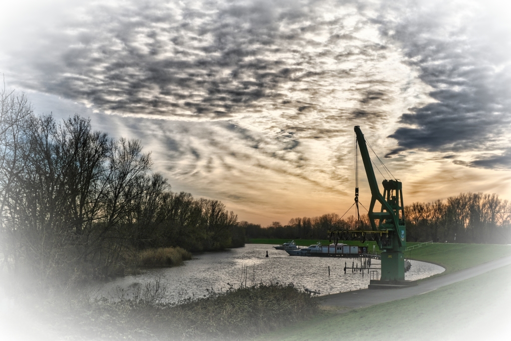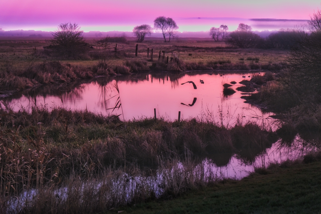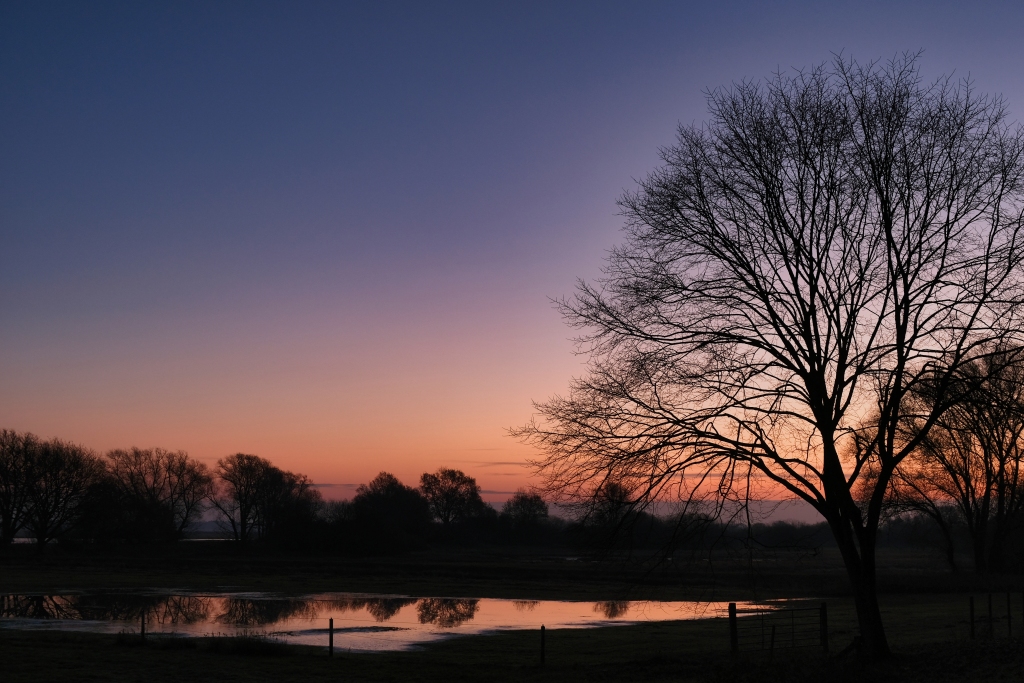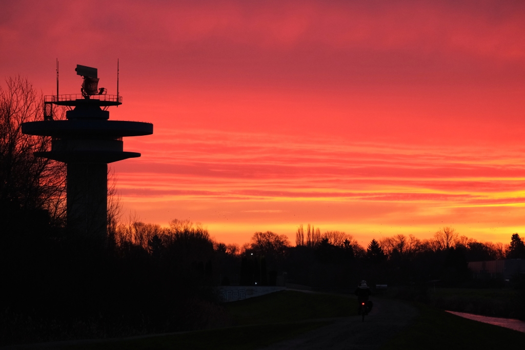 Weiter geht es am nächsten Morgen von Arsten Zielrichtung Vegesack. Fulminant der Tagesstart mit einem außergewöhnlichen Morgenrot welches die Landschaft regelrecht flutet. Hier bewährt sich erneut die Erkenntnis zeitig vor dem Sonnenaufgang die Wanderschuhe zu schnüren, es bestätigt aber auch die Wetterregel, dass ein fulminantes Morgenrot auf schlechtes Wetter hindeutet. So wird es für den Rest des Tages vor sich hin nieseln, was das Wanderlebnis jedoch nicht beeinträchtigt. Vis a vis der Kladdinger Wiesen wandert man auf einer Länge von vier Kilometern entlang der südlichen Flanke des Bremer Flughafens. Während am heimischen Frankfurter Flughafen im Minutentakt Flugzeuge starten und landen sind auf dieser vier Kilometer langen Passage gerade einmal drei Flugbewegungen auszumachen – aus hessischer Brille betrachtet eine Oase der Stille. So folgt man dem Flußverlauf Ochtum, dort wo früher auf dem Wasserweg Torf transportiert wurde, um den Stadtteil Huchtingen zu queren.