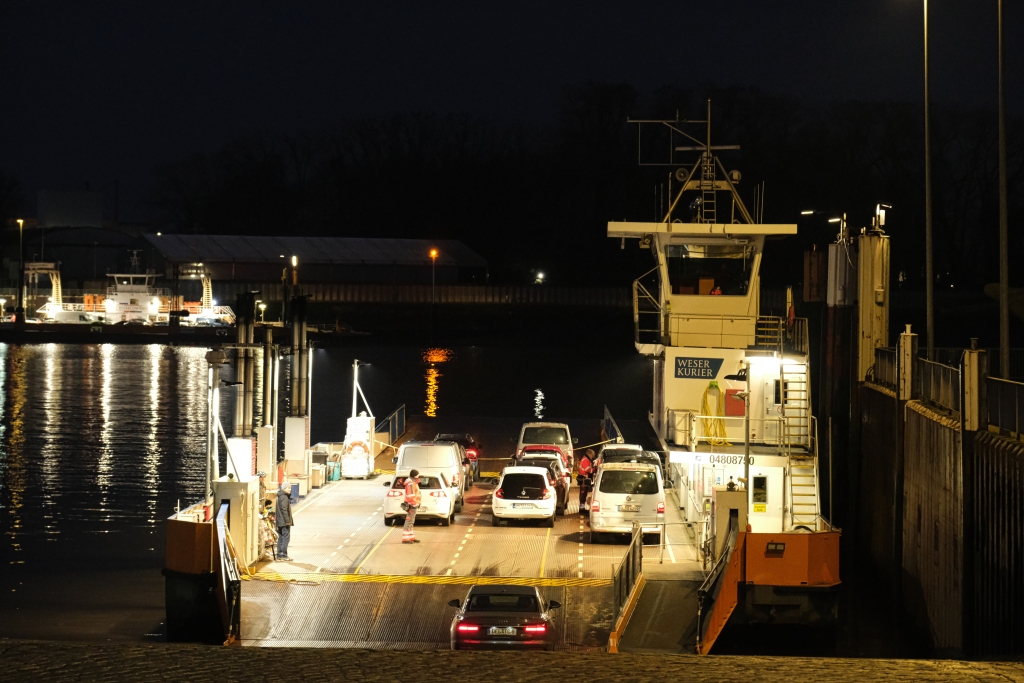 Hinter den Kladdinger Wiesen erreicht man Huchting, dort wo auch das Rolandcenter, welches als eines der ersten deutschen Einkaufscenter 1972 errichtet wurde, anzutreffen ist. Dahinter setzt der drögeste Abschnitt der gesamten Stadtrandwandertour an, jedoch sind bei einer solchen Gesamtstreckenlänge inspirationslose Abschnitte durchaus einzukalkulieren, die man eben zwangsläufig “abarbeitet” Nicht wirklich erbaulich ist der Vorschlag des Wanderplaners, der im Bremer Ortsteil Seehausen die Strecke entlang der gewaltigen Kläranlage vorbeischleift. Im Nachgang betrachtet bietet sich sinnigerweise eine gangbare Option durch das Marschland über den Steertgrabenweg und der Weißefeldstraße Richtung Weser an. Was folgt ist eine entspannte zehn Kilometer lange Deichwanderung entlang der Weser. So könnte man im Wanderflow sich locker fünfzig Kilometer weiter bis nach Bremerhaven bewegen. Bei Lernwerder geht es per Fähre hinüber nach Vegesack, dort wo am hiesigen Bahnhof diese Tagestour endet und man per Regionalbahn in 15 Minuten den Bremer Hauptbahnhof erreicht.