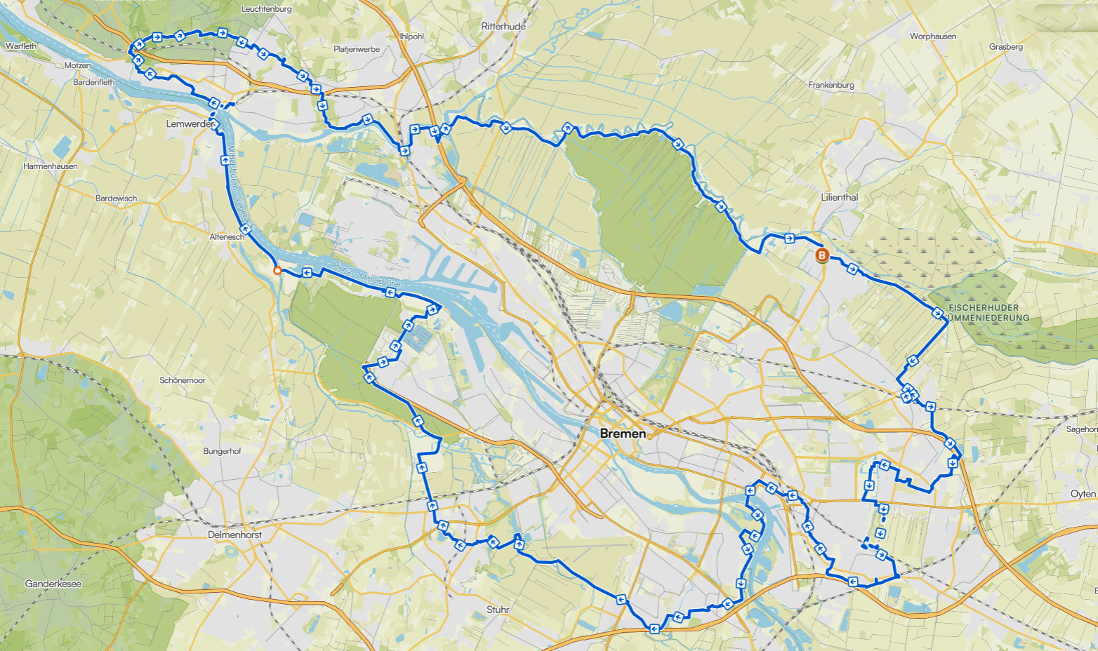 Der Bremer Stadtrandwanderweg – eine ausgezeichnete Idee um das Bremer Land zu entdecken. Dank gilt dem Streckenentwickler Ullrich Horstmann, der hierzu einen 112 Seiten starken Wanderführer aufgelegt hat, der hervorragend ist, um sich einen Überblick zu verschaffen. Das Büchlein selbst ist jedoch nicht wirklich praxistauglich. Die Streckenführung ist akribisch niedergelegt. (Beispiel: An der Mahndorfer Heerstraße wenden wir uns kurz nach links, gehen an einem Supermarkt vorbei, biegen hinter der Schule rechts in die Hexenstiege ab….). So mag man im 19. Jahrhundert Wanderführer konzipiert haben, denn das begleitende und abgebildete Kartenmaterial ist nicht zu gebrauchen (Beschriftungsgröße 4 dpi), ein kompletter Streckenüberblick fehlt gänzlich und GPS-Tracks stehen nicht zur Verfügung. Es ist nicht anzunehmen, dass Wanderinteressierte mit dem Wanderführer in der Hand streckensuchend durch die Landschaft mäandern, da es zudem keine Wanderwegsbeschilderung gibt, obschon dies ein Herzenswunsch des Streckenentwicklers wäre. So sollte eine zweite Auflage zeitgemäß überarbeitet werden.